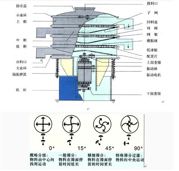旋振篩是由直立式電機作激振源,電機上、下兩端安裝有偏心重錘,將電機的旋轉運動轉變?yōu)樗健⒋怪薄A斜的三次元運動,再把這個運動傳遞給篩面。通過調(diào)節(jié)上、下兩端的相位角,可以改變物料在篩面上的運動軌跡,通過增減振動電機上下兩端的偏心重錘配重塊重量可以增加和減少震動幅度。