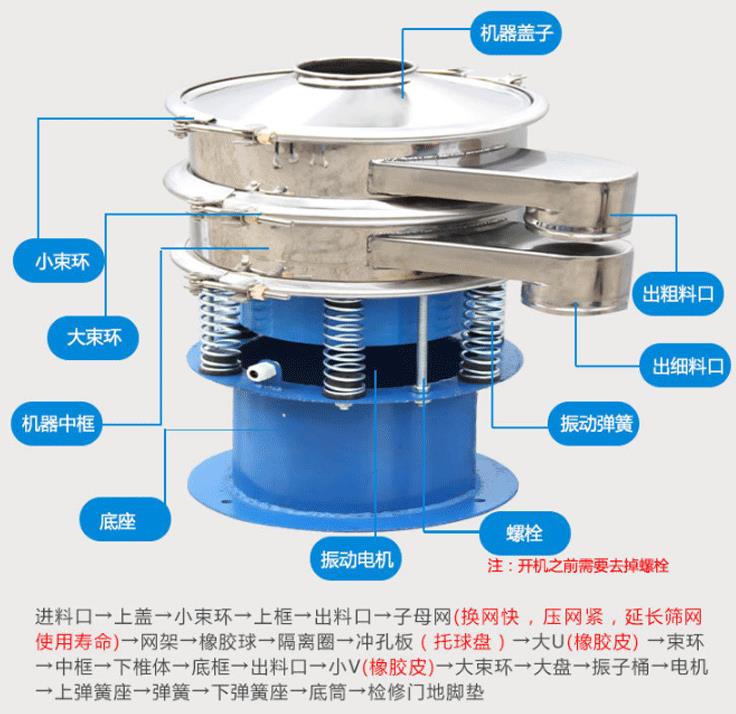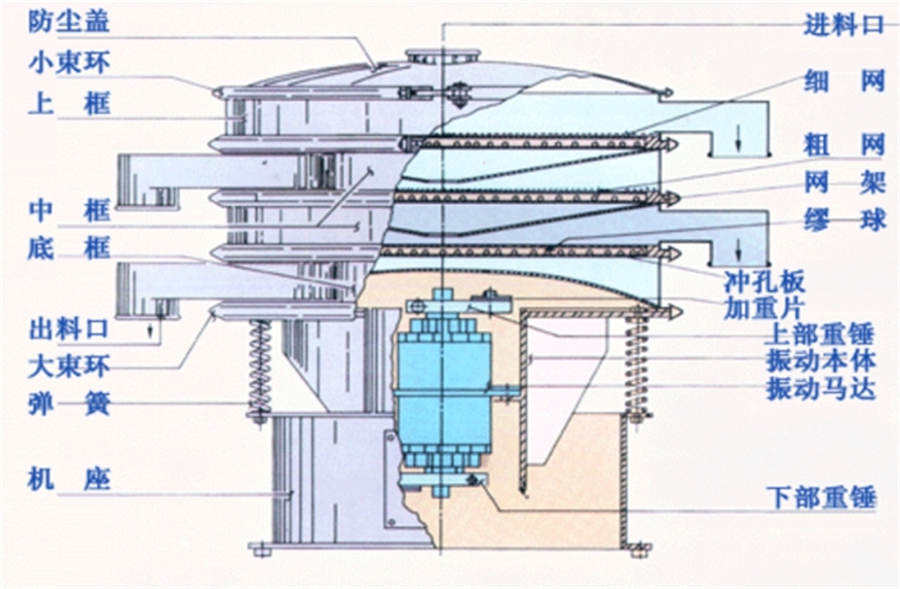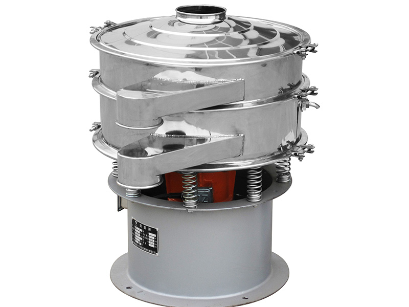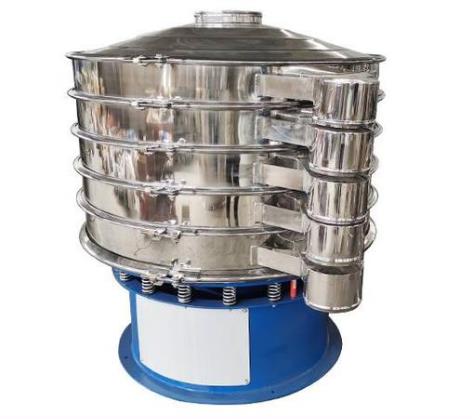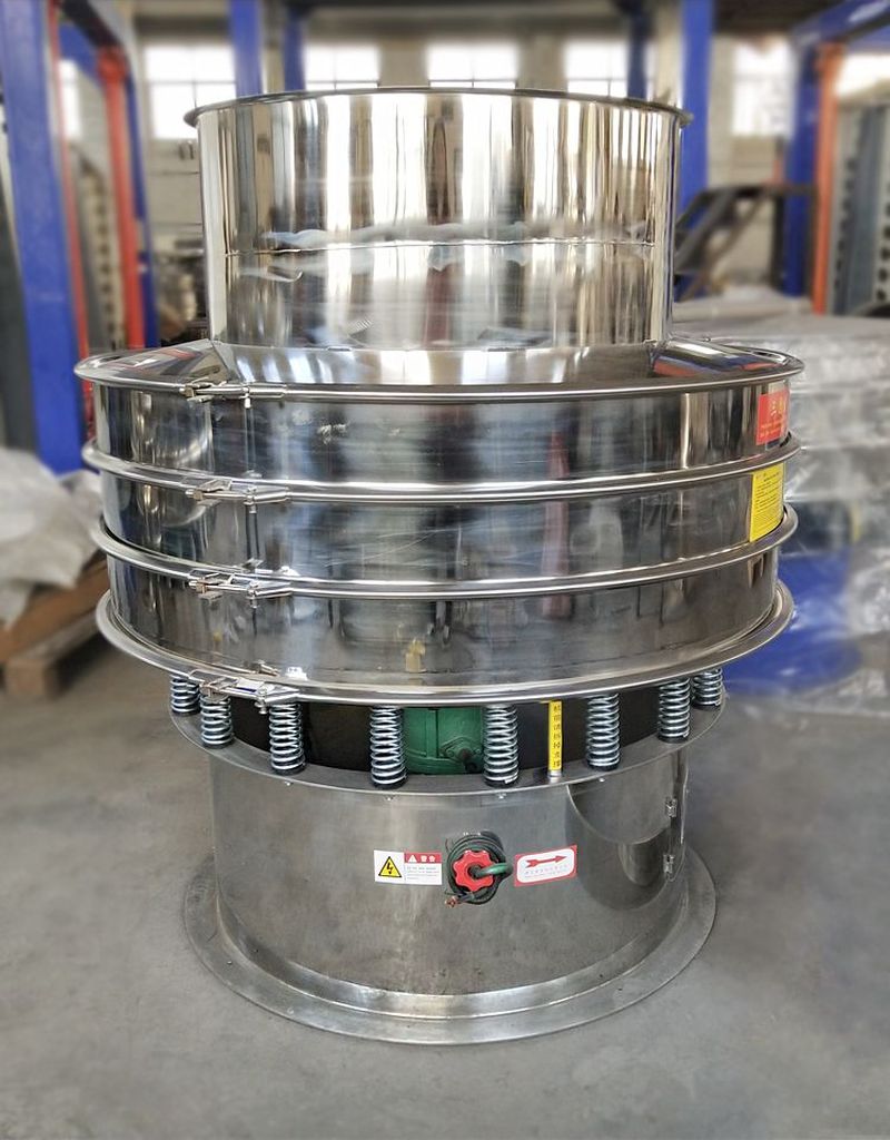 旋振篩是一種高精度細(xì)粉篩分機(jī)械,其噪音低、效率高,快速換網(wǎng)只需3-5分鐘,全封閉結(jié)構(gòu),適用于粒、粉、粘液等物料的篩分過濾。旋振篩是由直立式振動(dòng)電機(jī)作激振源,電機(jī)上、下兩端安裝有偏心重錘,將電機(jī)的旋轉(zhuǎn)運(yùn)動(dòng)轉(zhuǎn)變?yōu)樗健⒋怪薄A斜的三次元運(yùn)動(dòng),再把這個(gè)運(yùn)動(dòng)傳遞給篩面。調(diào)節(jié)電機(jī)上、下兩端的相位角,可以改變物料在篩面上的運(yùn)動(dòng)軌跡。