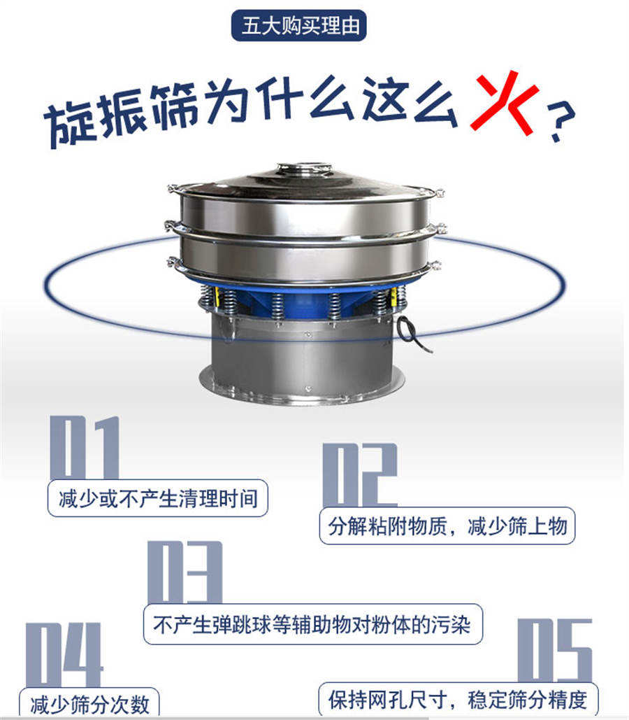 篩選范圍廣--只有系列三次元旋振篩能分選如此廣的原料范圍:任何顆粒、細(xì)粉、漿液都可以篩選。篩分細(xì)500目(28微米),過濾細(xì)5微米。網(wǎng)孔防堵塞--三次元振動(dòng)功能及自動(dòng)清理堵網(wǎng)裝置把堵網(wǎng)幾率降到小。 單層或多層分選--每臺(tái)旋振篩可選一至五層篩網(wǎng),能同時(shí)進(jìn)行二到六個(gè)等級(jí)的分選或過濾。
