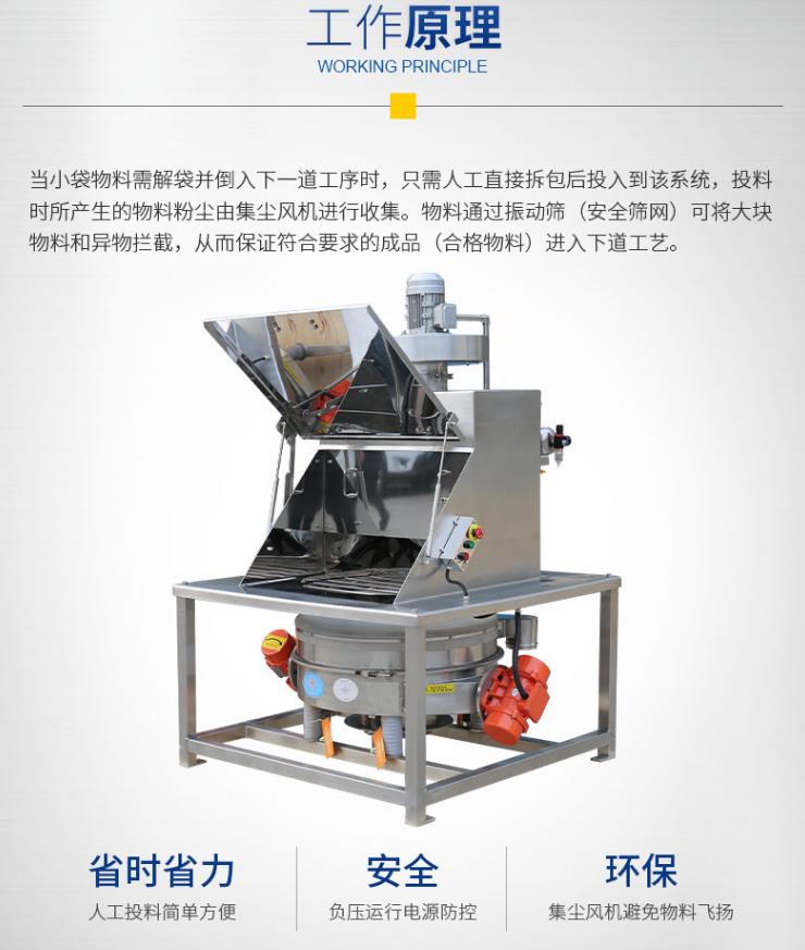 當小袋物料需要解袋并倒入下一道工序時,只需人工直接拆包后投入到該系統,投料時所產生的物料粉塵由集塵風機進行收集。物料通過安全篩網可將大塊物料和異物攔截,從而保證符合要求的顆粒排出。該系統適用于制藥、化工、食品行業中小袋物的投放、篩分和卸料,特別適用于針對流動性較差物料的投料和篩分,拆包時由于集塵風機的作用,可以避免物料粉塵到處飛揚。