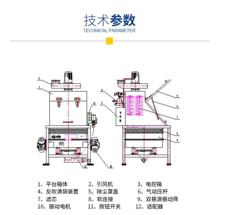 無塵投料站由人工傾卸箱,反壓供料平臺,格柵,下層沙坑,振動器,過濾系統,除塵系統,回吹氣囊等組成。