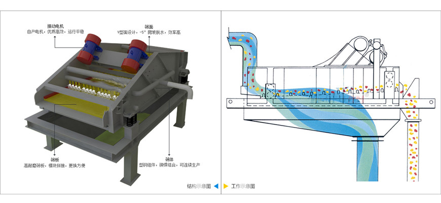 脫水篩又稱高頻脫水篩,通過激振力改變了礦漿表面的水張力,漿水透過篩網成為篩下物,而微細物料被篩網阻隔形成濾層受振動力影響向前運動排出。脫水篩主要用于選礦行業的尾礦脫水、選煤廠的煤泥脫水、水洗石英砂脫水和陶瓷泥漿脫水,以及電力、制糖、制鹽等工業部門對中細顆粒物料進行干濕式分級、脫水、脫介和脫泥。