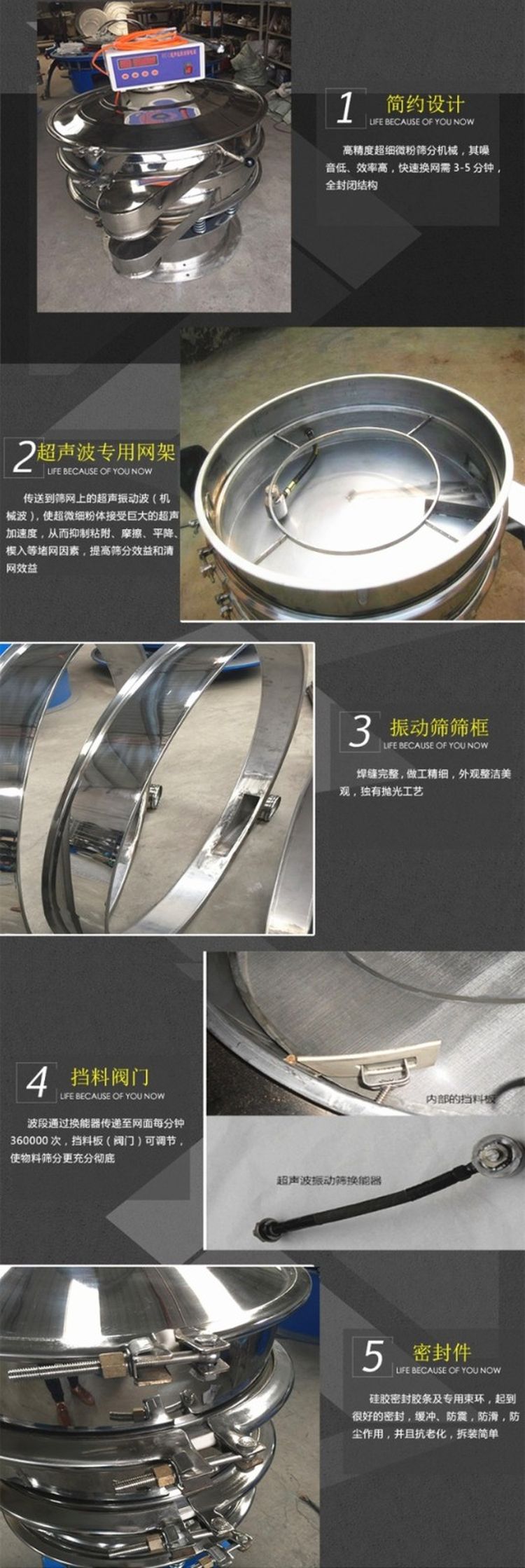 超聲波振動篩是在旋振篩的基礎(chǔ)上引入了超聲波清網(wǎng)裝置,通過將220V、50Hz或110V、60Hz電能轉(zhuǎn)化為18KHz的高頻電能,輸入超聲換能器,將其變成18KHz機械振動,從而達到高篩分和迅速清網(wǎng)的目的,使超微細粉篩分成為易事。該系統(tǒng)在傳統(tǒng)的振動篩基礎(chǔ)上在篩網(wǎng)上引入一個低振幅、高頻率的超聲振動波(機械波),以改善超微細粉體的篩分性能。特別適合高附加值精細粉體的用戶使用。超聲波篩分系統(tǒng)是一種簡單實用、可靠的篩分系統(tǒng),是當前網(wǎng)孔堵塞的有效的解決方法。可廣泛應(yīng)用于制藥、冶金、化工、選礦、食品等要求精細篩分過濾的行業(yè),篩分過濾精度高,有效解決因團聚、靜電、強吸附性卡堵網(wǎng)孔等篩分難題,是國內(nèi)篩分行業(yè)的一項重大技術(shù)突破。